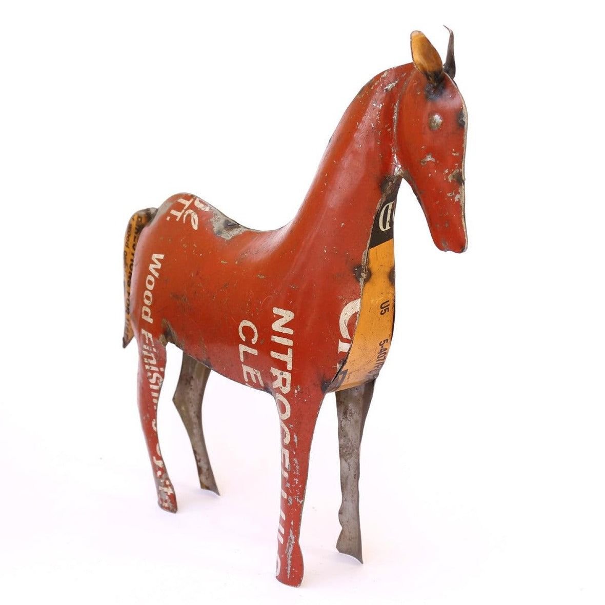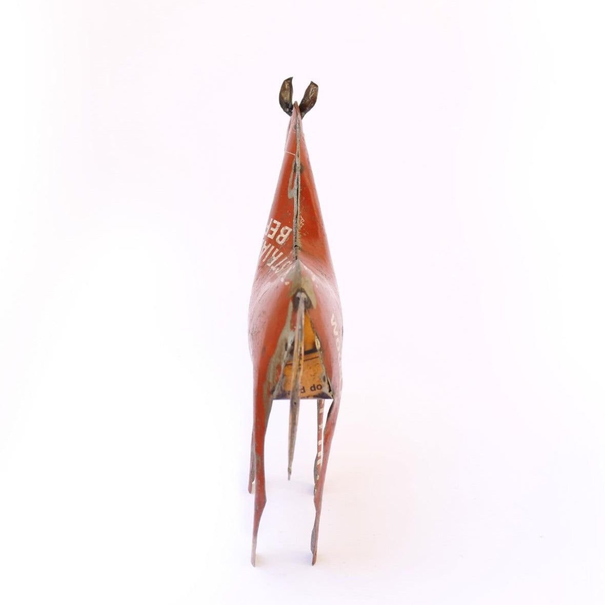 Like the bunny and cat figurines you previously inquired about, this horse is meticulously created from 100% upcycled scrap metal salvaged from factories and junkyards. The visible text and graphics on the horse’s body are part of its authentic charm, reflecting the original recycled iron packaging material.