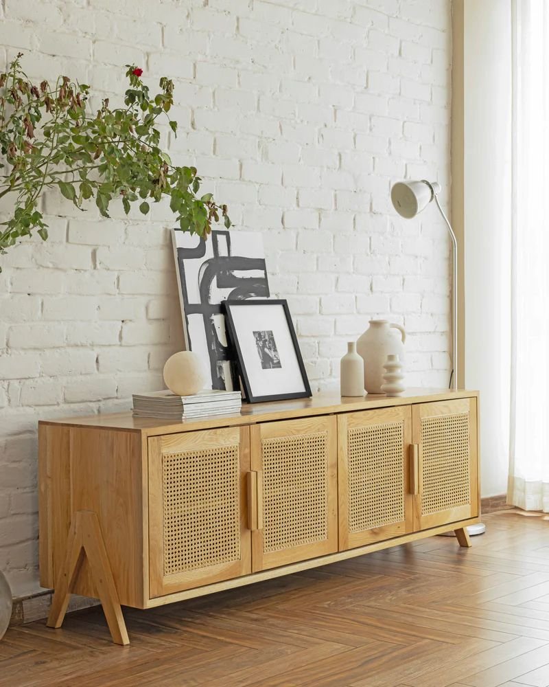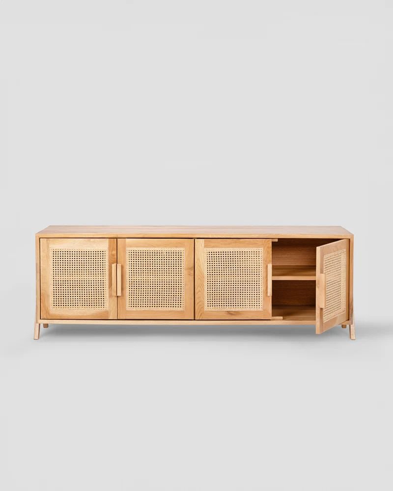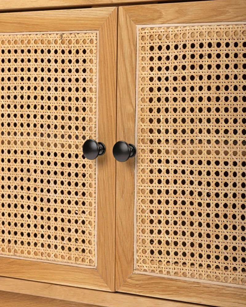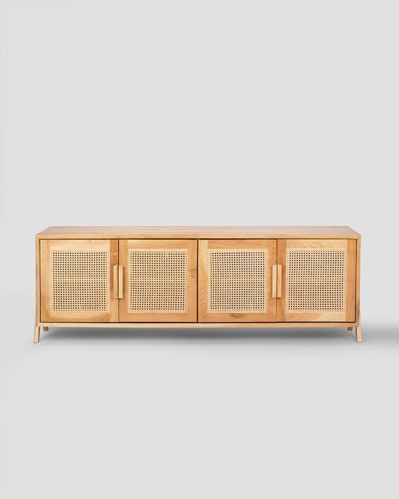 The sideboard in the image is an artisanal cane and wood sideboard, specifically identifiable as a 4-door buffet cabinet or media console featuring a transitional coastal or bohemian aesthetic. It is defined by its clean-lined solid wood frame (typically oak, teak, or mango wood) and signature handwoven natural rattan cane door panels.