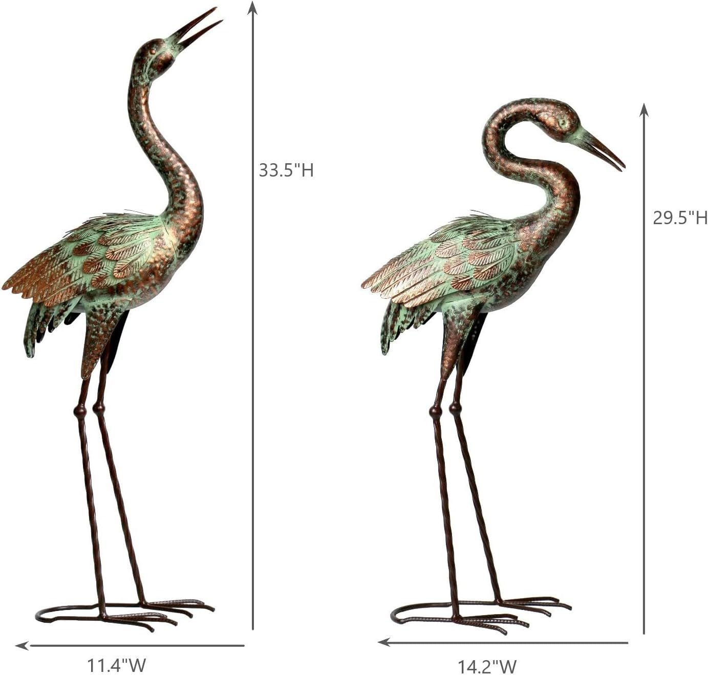 The Shorayn Garden Crane Statues are handcrafted metal sculptures featuring a blue heron design with a patina finish.
