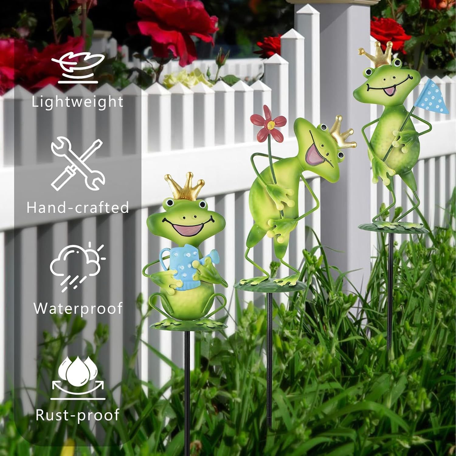 The Frog Garden Stakes shown in your images are vibrant, handcrafted metal ornaments from Jodhpur crafts Works. These “Frog Prince” stakes are designed to be durable, lightweight, and weather-resistant, adding a whimsical touch to any outdoor setting.