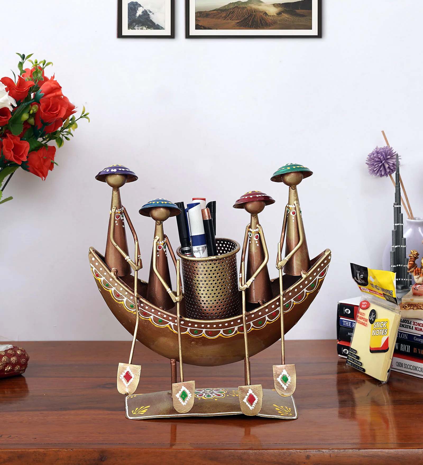 Handcrafted Metal Boat Pen Holder with Tribal Musicians