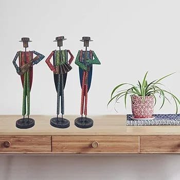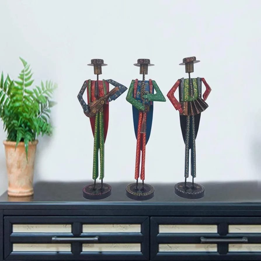 Bring a touch of traditional charm to your living space with this Handcrafted Metal Tribal Musician Showpiece Set. Featuring three elegantly designed tribal musician figurines holding musical instruments, this decorative set beautifully represents Indian folk art and craftsmanship. Made from durable metal and finished with vibrant hand-painted colors, these figurines create a striking decorative accent for your living room, office, or display shelves. Perfect for adding cultural elegance to your interiors, this unique set also makes a thoughtful gift for art lovers and décor enthusiasts.