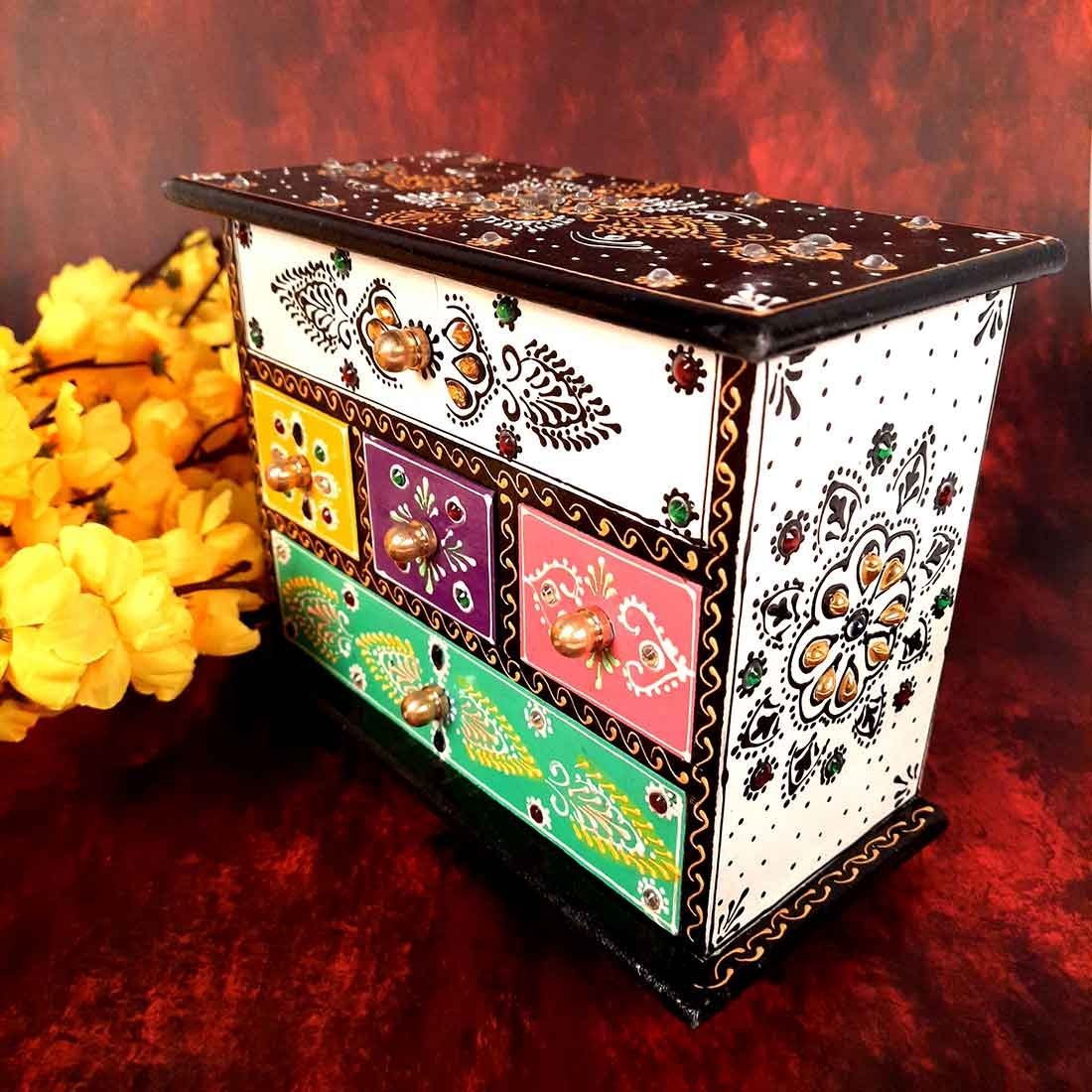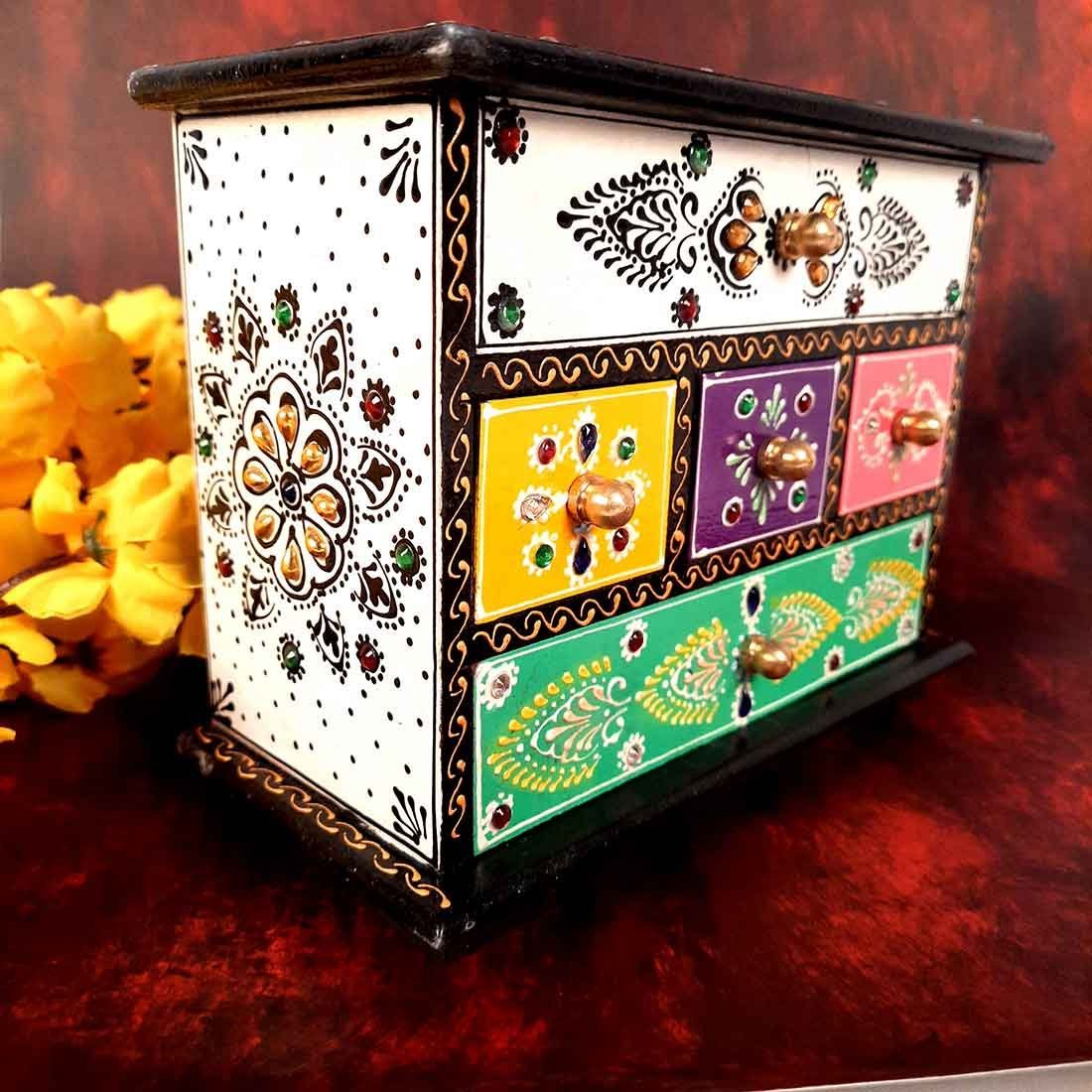 Bring vibrant traditional craftsmanship to your home with this beautifully handcrafted wooden jewelry storage box. Designed with colorful hand-painted drawers, intricate floral patterns, and decorative stone embellishments, this organizer adds a unique artistic touch to your dressing table or home décor. The compact chest features multiple drawers that provide convenient storage for jewelry, accessories, small valuables, and keepsakes. Made from sturdy wood and finished with detailed craftsmanship, this decorative storage box is perfect for organizing your essentials while enhancing the aesthetic of your space. It also makes a thoughtful gift for special occasions.