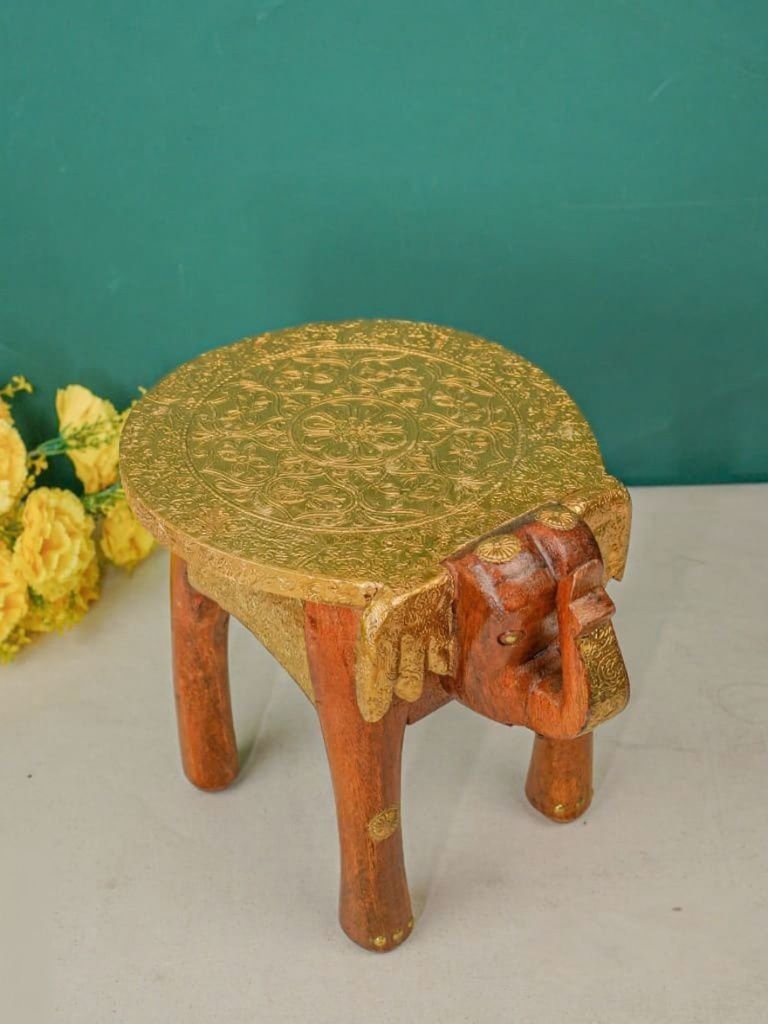 Add a touch of traditional elegance to your home with this handcrafted wooden elephant stool featuring a beautifully engraved brass top. Designed in the shape of an elephant, this unique piece showcases fine craftsmanship with a natural wooden finish and decorative brass detailing. The sturdy wooden structure provides durability, while the brass surface adds a rich, antique look. Perfect as a small stool, side table, plant stand, or decorative accent, this versatile piece enhances the charm of living rooms, bedrooms, entryways, or balconies. It also makes a thoughtful gift for housewarming, festivals, and special occasions.