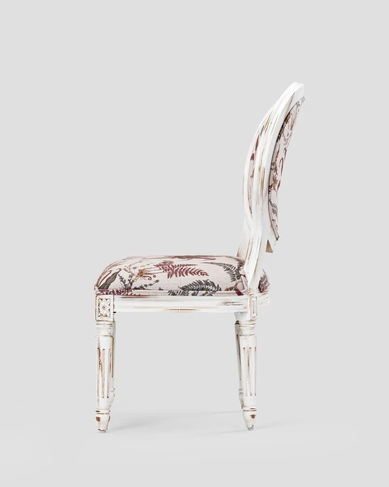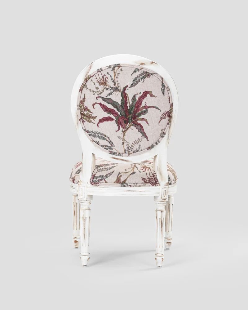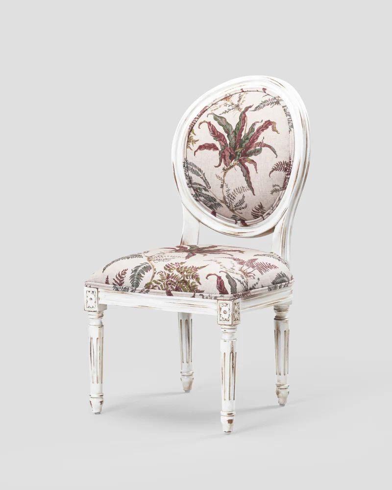This charming piece is the ARTE chair from Jodhpur Crafts , a neoclassical side chair that brings a “portal to blissful elegance” to any room. It is a quintessential Louis XVI style chair, characterized by its distinctive medallion (oval) back and architectural straight lines.