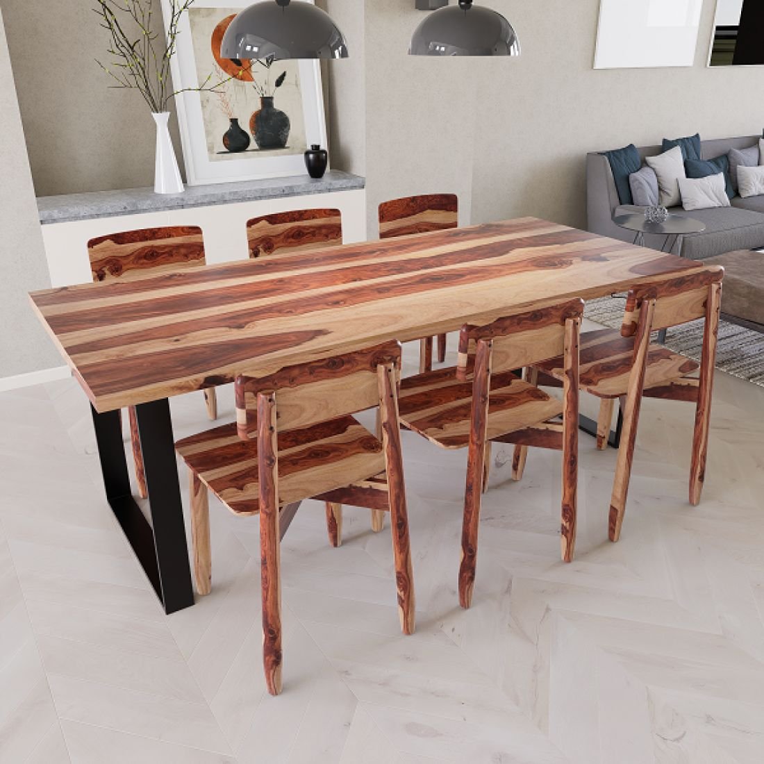 The dining set in your image is a six-seater handcrafted Sheesham wood dining set featuring a striking two-tone natural wood grain and an industrial-style iron base.
