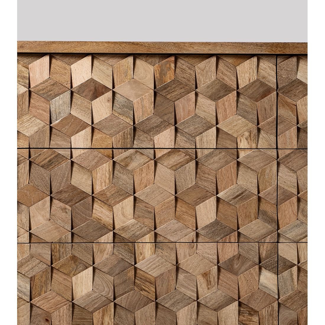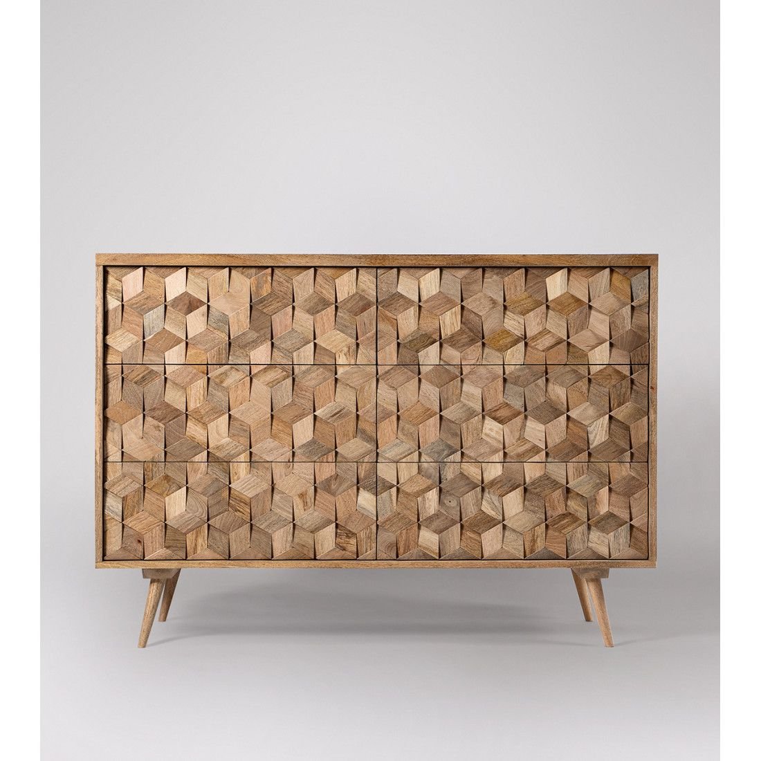The piece of furniture in your image is the Terning six-drawer chestfrom Swoon, a mid-century modern design featuring a striking 3D tessellated facade.