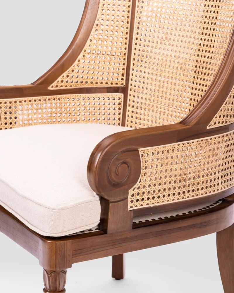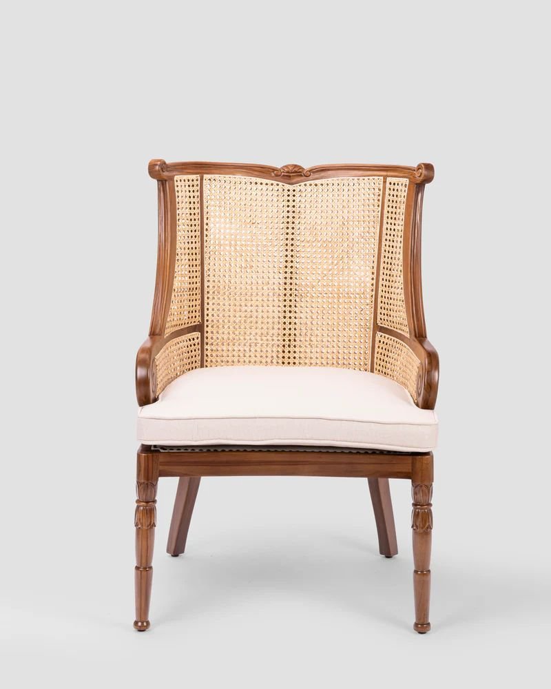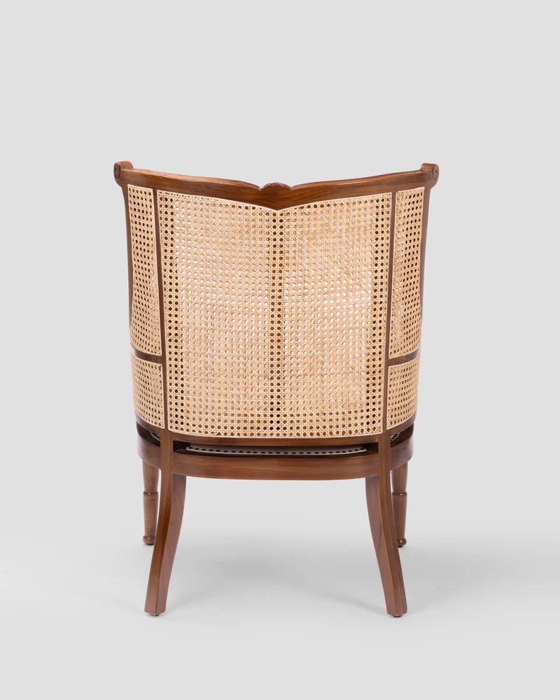 The chair in the image is an elegant, traditional French-style accent chair characterized by its combination of handwoven natural rattan cane and solid wood construction. Specifically, this piece is known as the Dreska chair, often crafted from high-quality teak wood with a walnut finish to complement its intricate backrest.