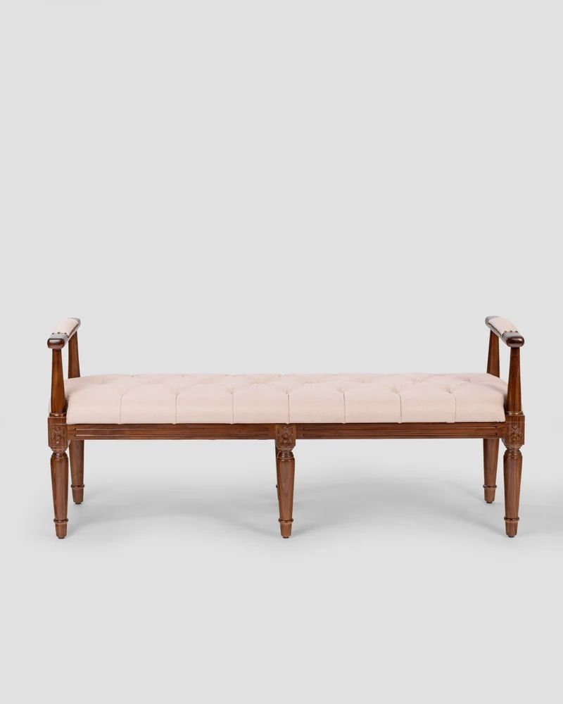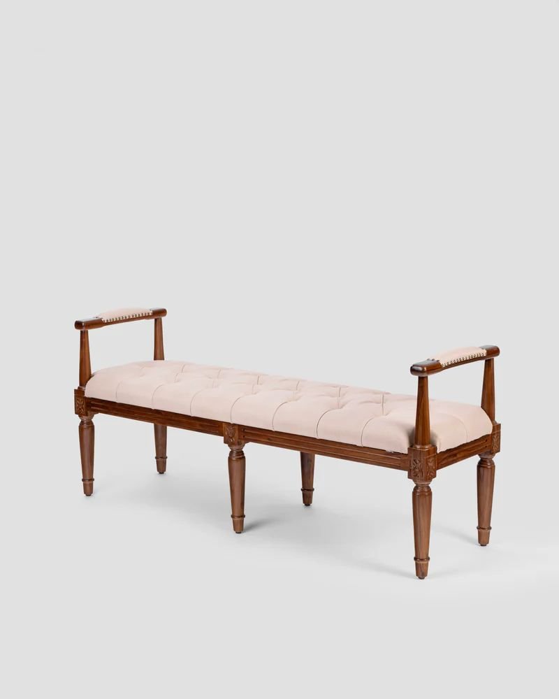 This elegant piece is a tufted upholstered bench with arms, often called a “window bench” or “end-of-bed bench,” featuring classic French-inspired design elements.