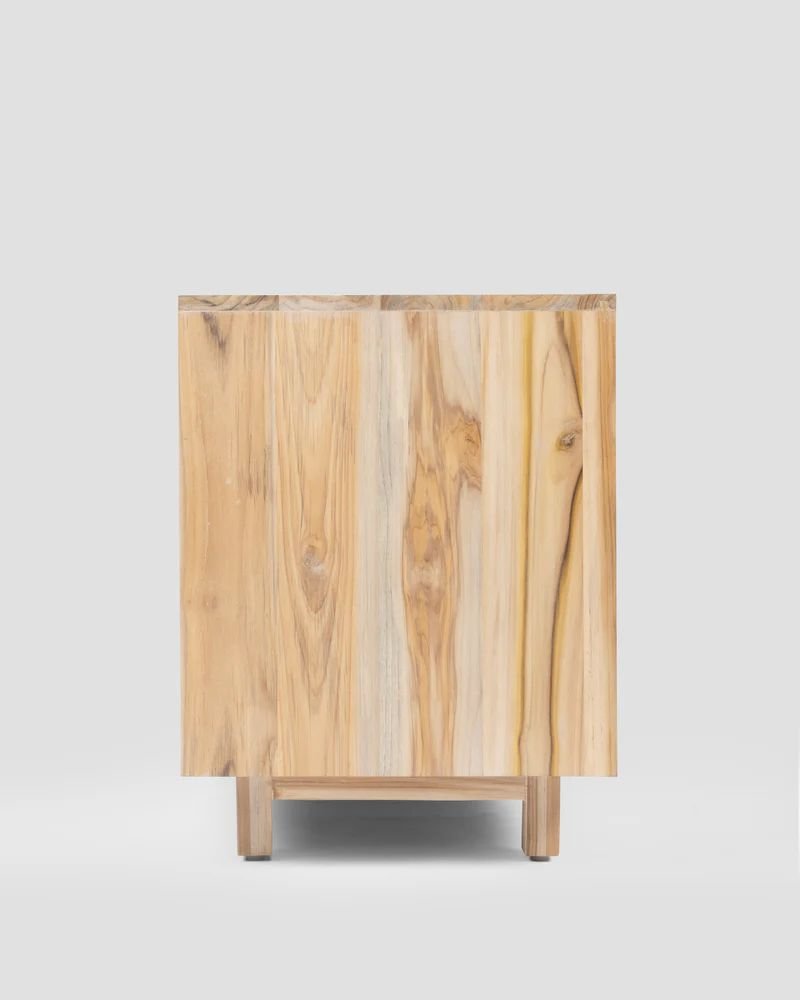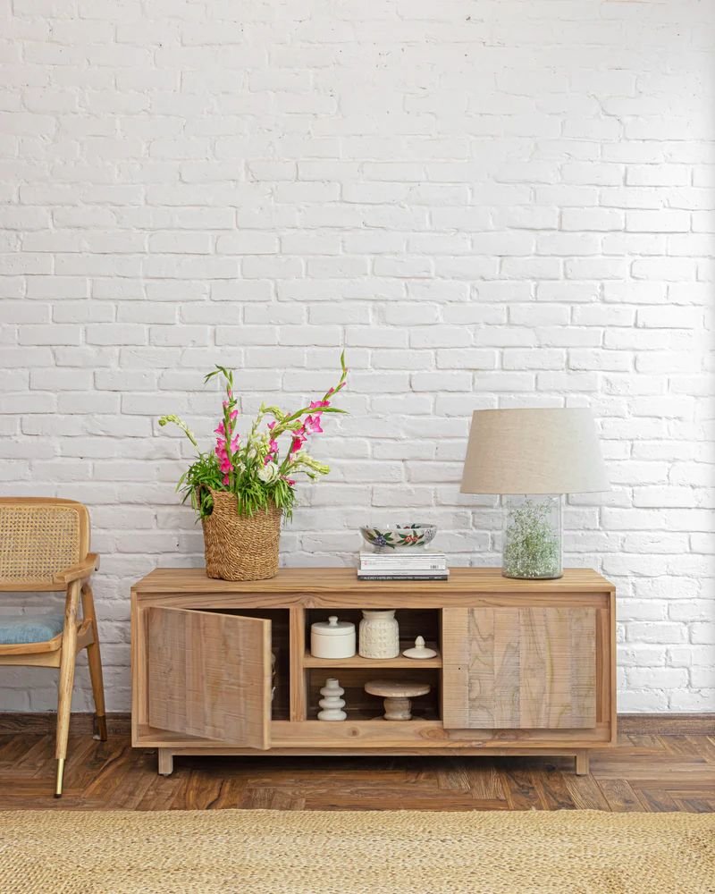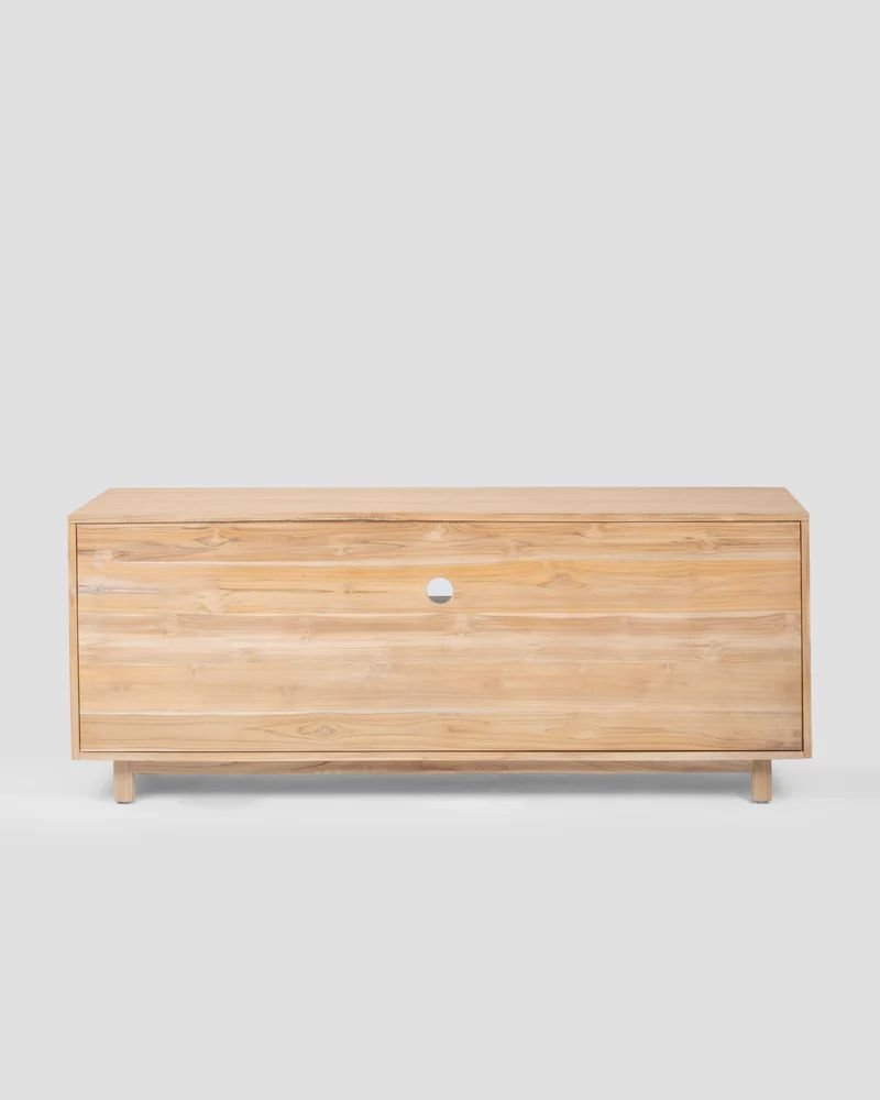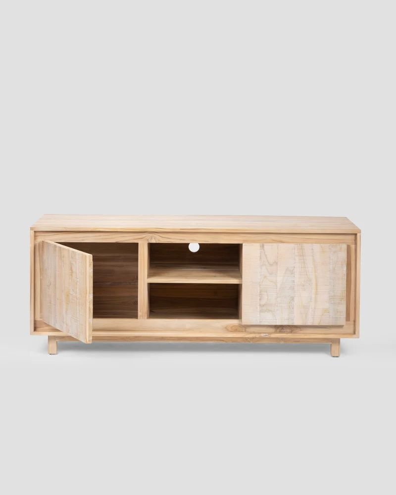 The TV unit pictured is the KOPEN TV Unit (or storage unit) from Jodhpur Crafts. It is a modern, minimalist media console crafted from light-toned solid wood, often teak, featuring a serene and airy aesthetic.