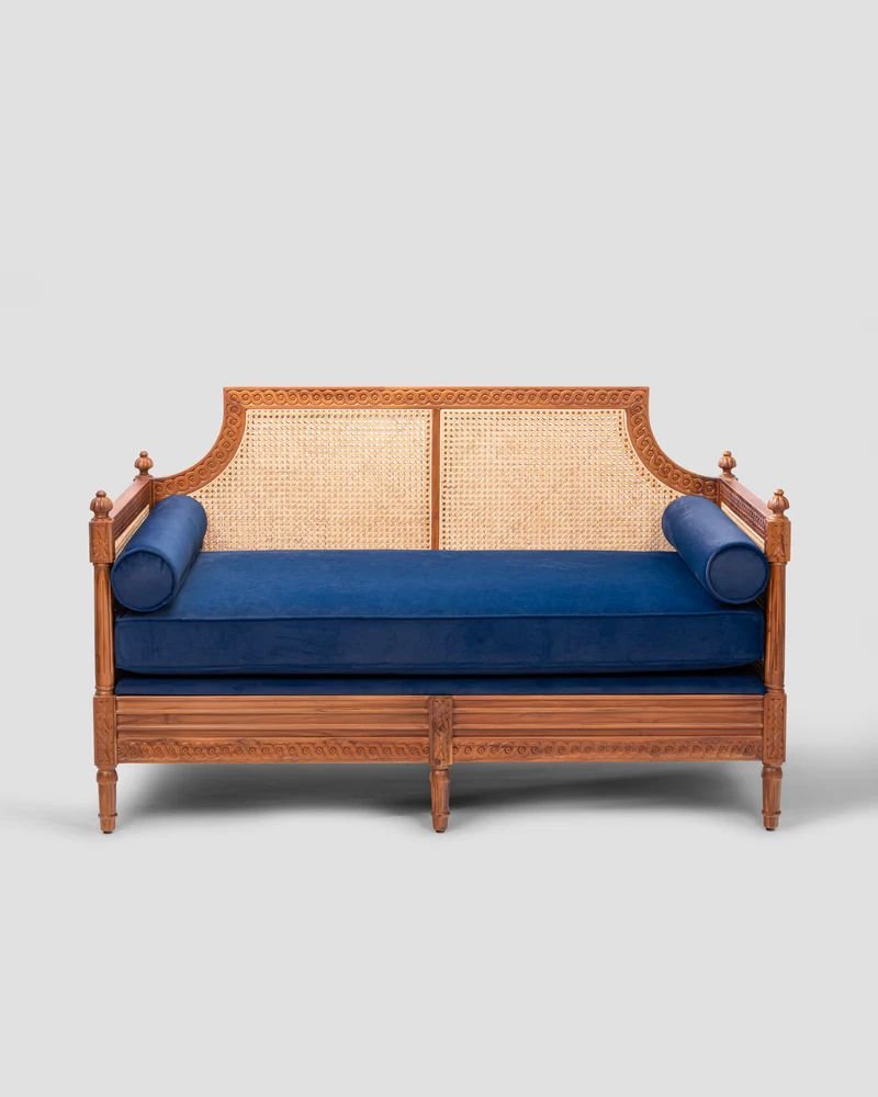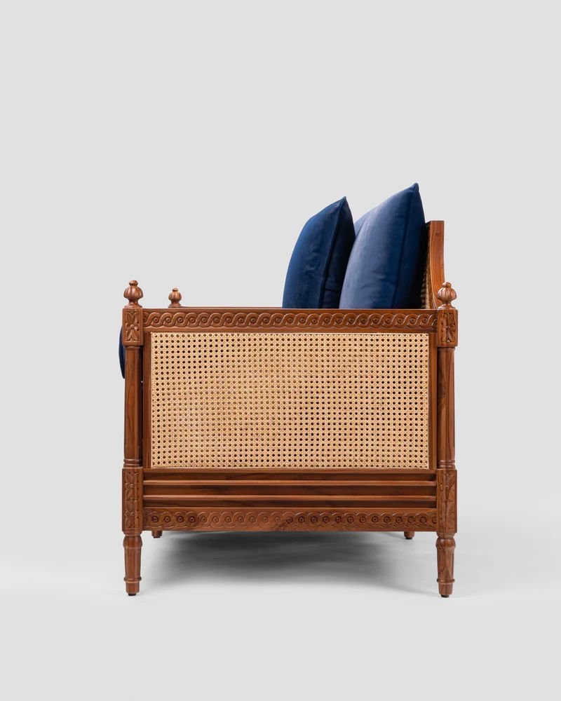 The regal piece in the image is the SAVOIR 2-Seater Sofa fromJodhpur crafts. It is an exquisite example of traditional colonial-style furniture, often referred to as a daybed or sette, that blends intricate hand-carved woodwork with natural textures.
