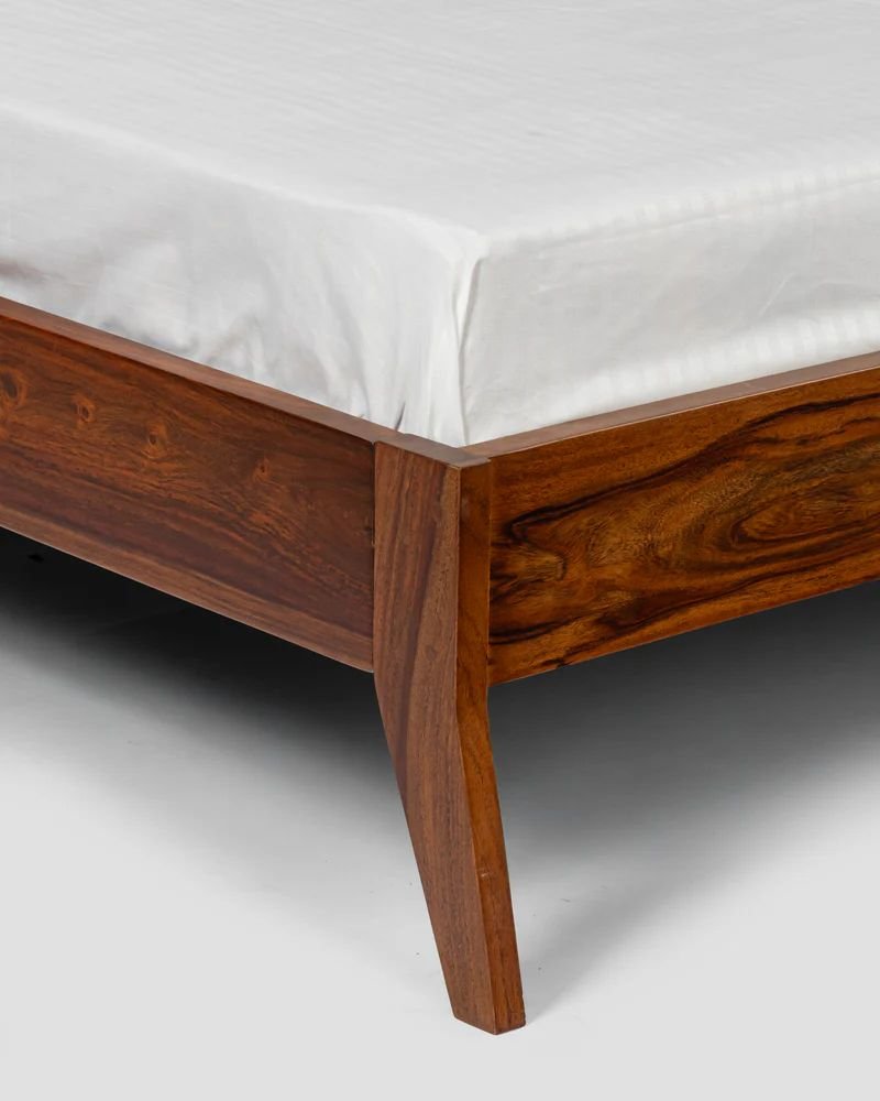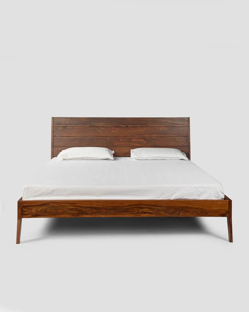 This is the Stellan Bed, a utilitarian design crafted from solid teak wood and finished in a deep “Forest Walnut” tone. It is sold by Jodhpur Crafts, where it is highlighted for its honest, unornamented aesthetic that prioritizes material and proportion.
