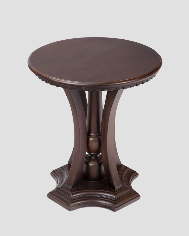 The elegant piece shown is a traditional pedestal side table, distinguished by its architectural base and rich walnut finish. It features a smooth, round tabletop with a decorative fluted or dentil-moulded edge, supported by a central column flanked by four gracefully curved wooden legs that rest on a sturdy, tiered pedestal base.