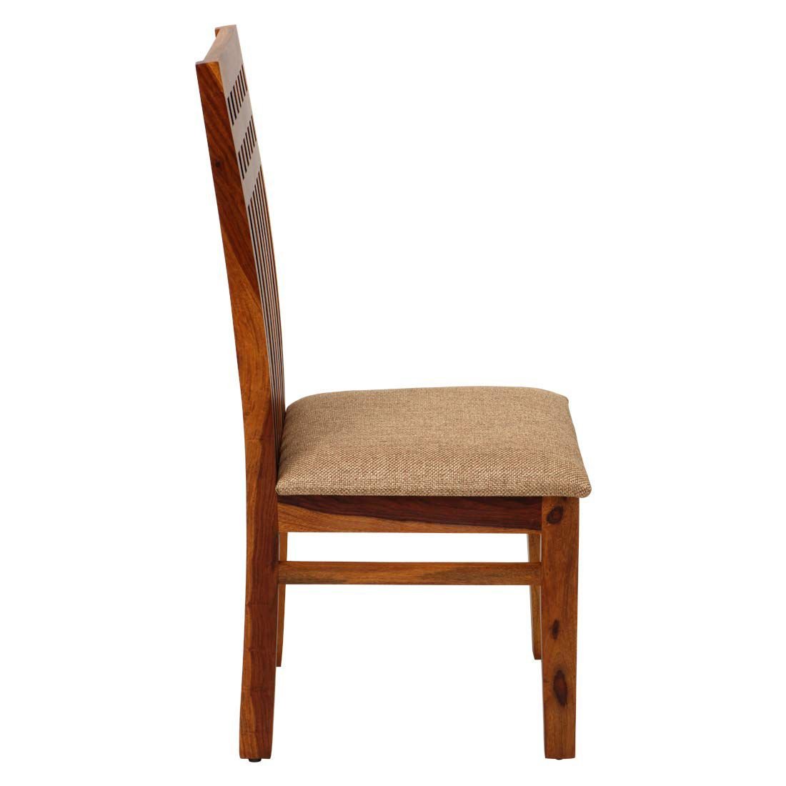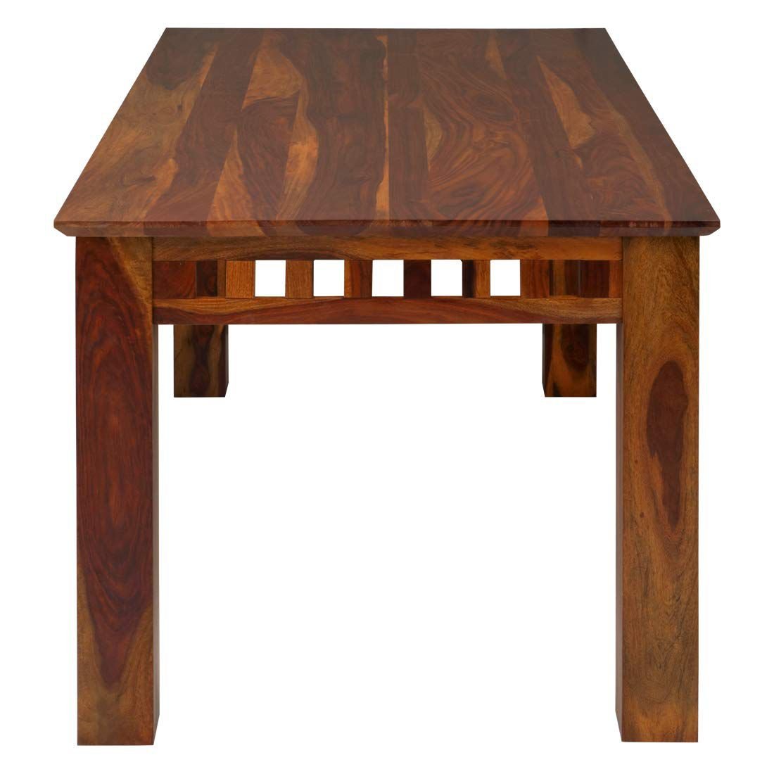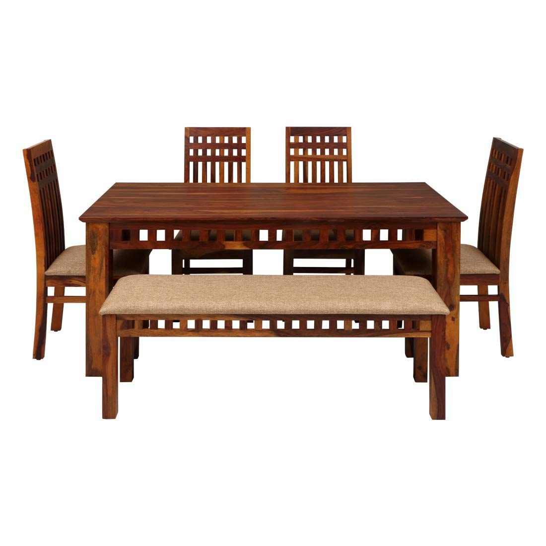 • Design & Material: Handcrafted from premium solid Sheesham wood (Indian Rosewood), it features a signature lattice-style slatted pattern on the table apron, chair backs, and bench base. Both the chairs and the bench come with comfortable, fabric-upholstered seat cushions.