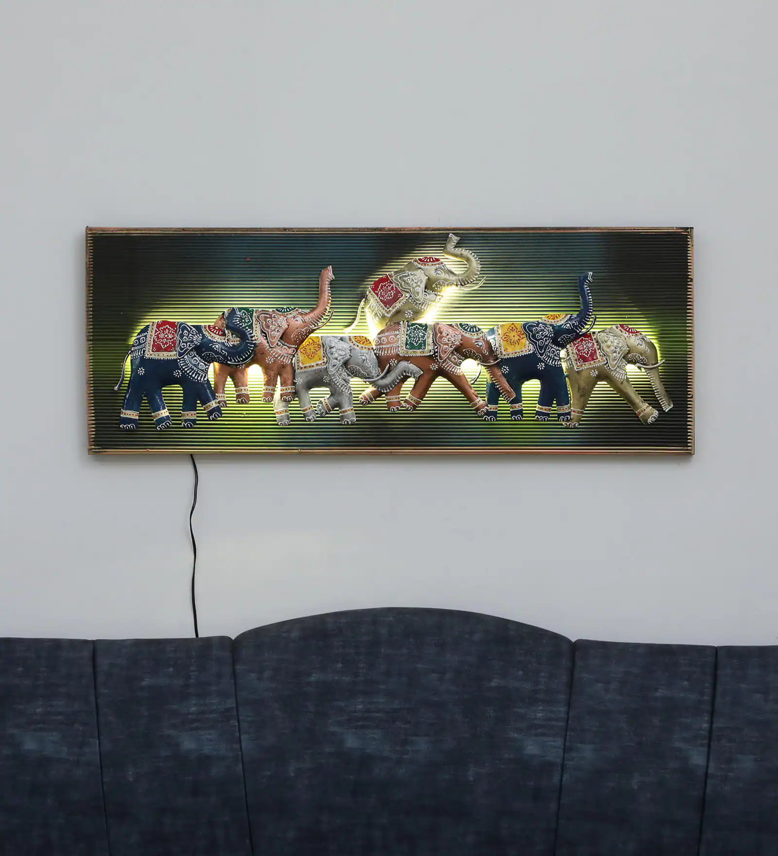 Enhance your interior décor with this stunning Handcrafted Elephant LED Metal Wall Art. Featuring a beautiful parade of intricately designed elephants, this decorative wall piece represents strength, prosperity, and good luck in traditional culture. Each elephant is carefully detailed with colorful ethnic patterns, creating a vibrant and artistic look. The integrated LED backlight adds a warm glowing effect, making the artwork stand out beautifully on any wall. Perfect for living rooms, hallways, bedrooms, offices, or entryways, this elegant wall décor blends traditional craftsmanship with modern lighting to create a captivating centerpiece.