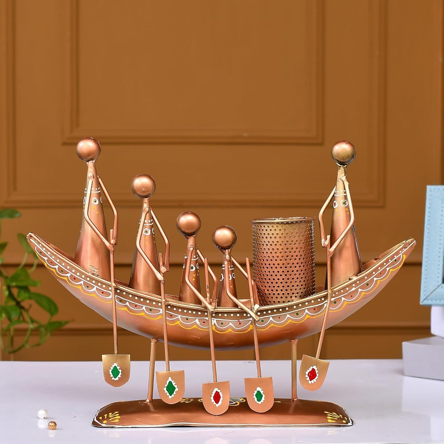 Add a touch of traditional artistry to your home with this Handcrafted Tribal Boat Metal Showpiece. Featuring beautifully crafted tribal figurines rowing a decorative boat, this artistic décor piece reflects the charm of ethnic craftsmanship. The center tea light holder creates a warm and soothing glow when lit, enhancing the ambience of your living space. Made from high-quality metal with intricate hand-painted detailing, this showpiece is perfect for decorating living rooms, dining tables, offices, or shelves while adding a unique cultural touch to your interiors.