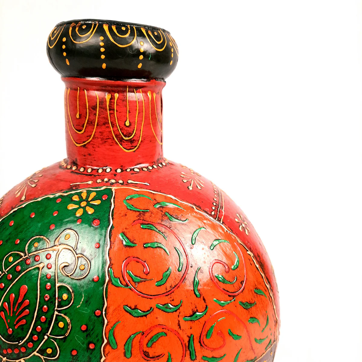 Add a vibrant touch of traditional artistry to your home with this Handcrafted Multicolor Decorative Vase. Featuring beautiful hand-painted patterns inspired by Indian folk art, this decorative vase showcases intricate detailing and bright colors that instantly enhance any interior space. Its unique rounded design and artistic finish make it a perfect centerpiece for tables, shelves, or console décor. Ideal for displaying artificial flowers or as a standalone decorative piece, this vase adds cultural charm and elegance to your home.