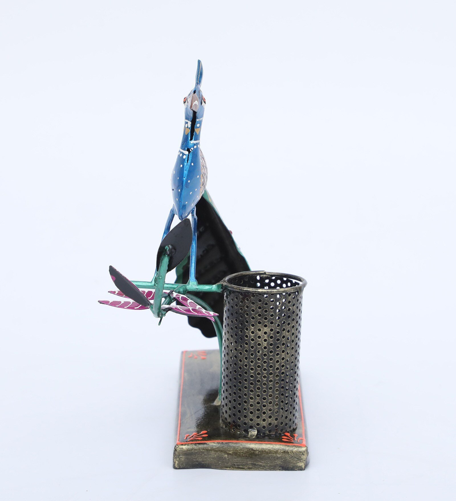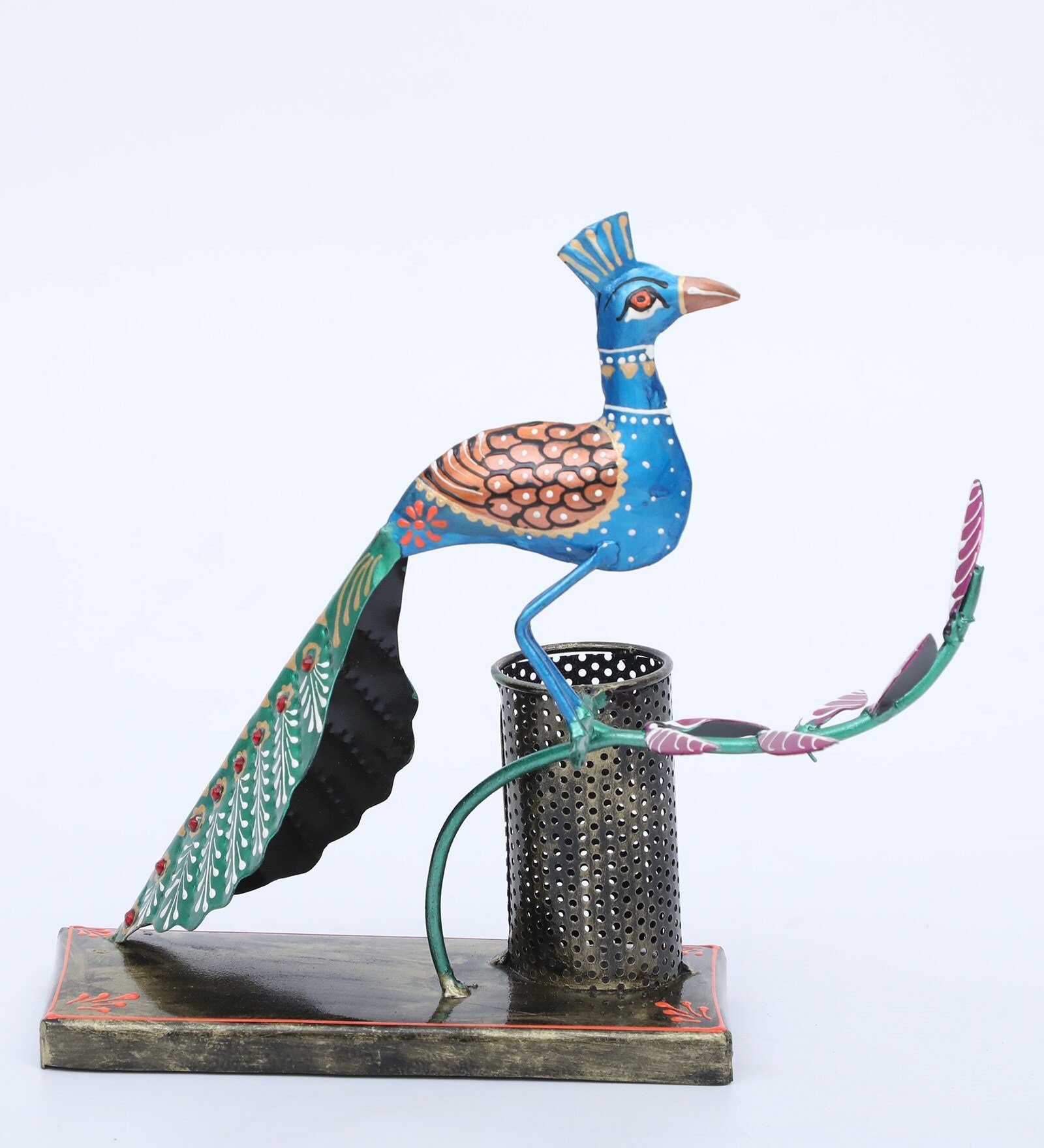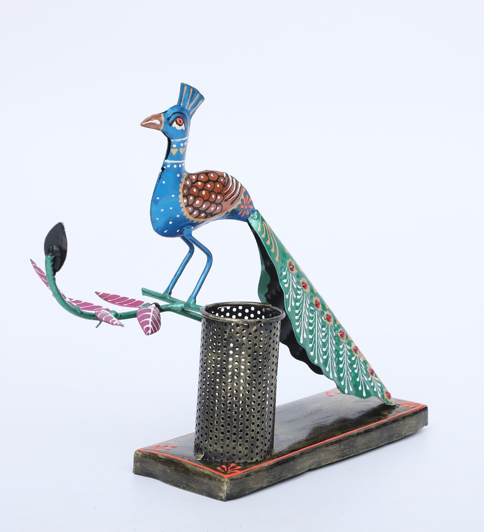 Add elegance and creativity to your workspace with this beautifully handcrafted Peacock Metal Pen Holder. Designed in the shape of a graceful peacock, this artistic desk organizer features intricate hand-painted details and vibrant colors inspired by traditional Indian folk art.