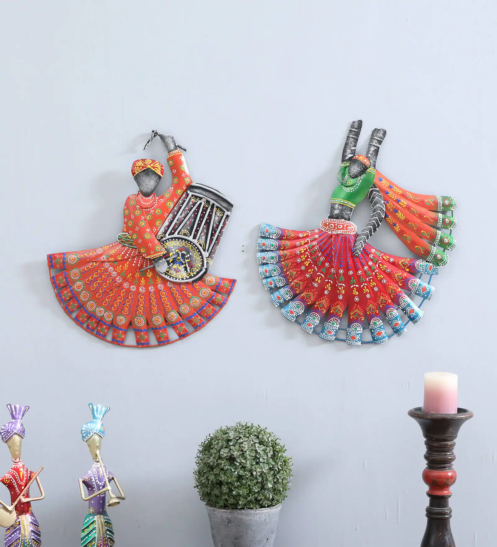 Add a vibrant and cultural touch to your home décor with the Rajasthani Folk Dance Couple Metal Wall Art (Set of 2), a beautiful and artistic decorative piece. This unique wall décor features a traditional Rajasthani couple performing folk dance and music, beautifully representing the charm of Indian folk culture.