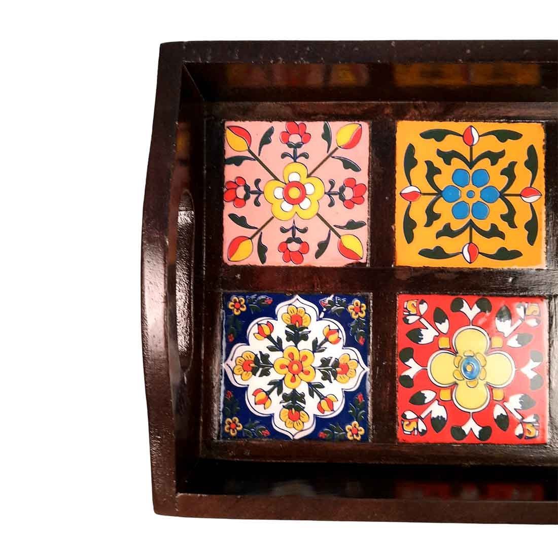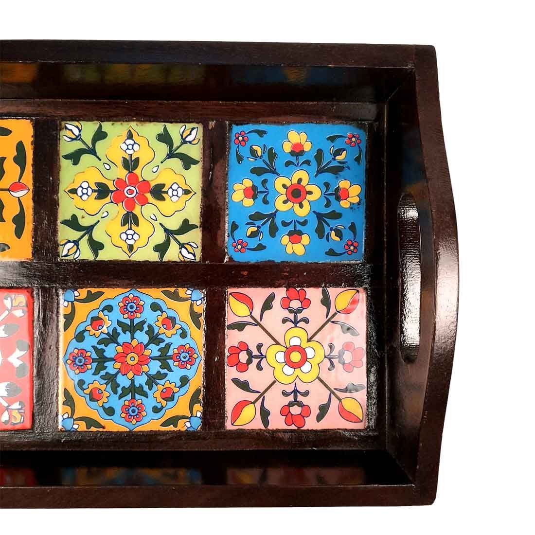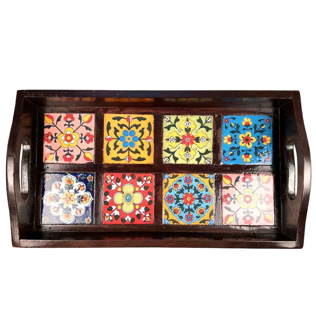 Bring style and functionality to your serving experience with this beautifully crafted wooden serving tray featuring colorful decorative ceramic tile artwork. The tray is designed with a sturdy wooden frame and vibrant floral-pattern tiles that add a charming artistic touch to your home décor. Its rectangular shape and built-in side handles make it convenient for carrying tea, coffee, snacks, or breakfast. Perfect for everyday use or special gatherings, this tray can also be used as a decorative centerpiece for coffee tables, dining tables, or kitchen counters.