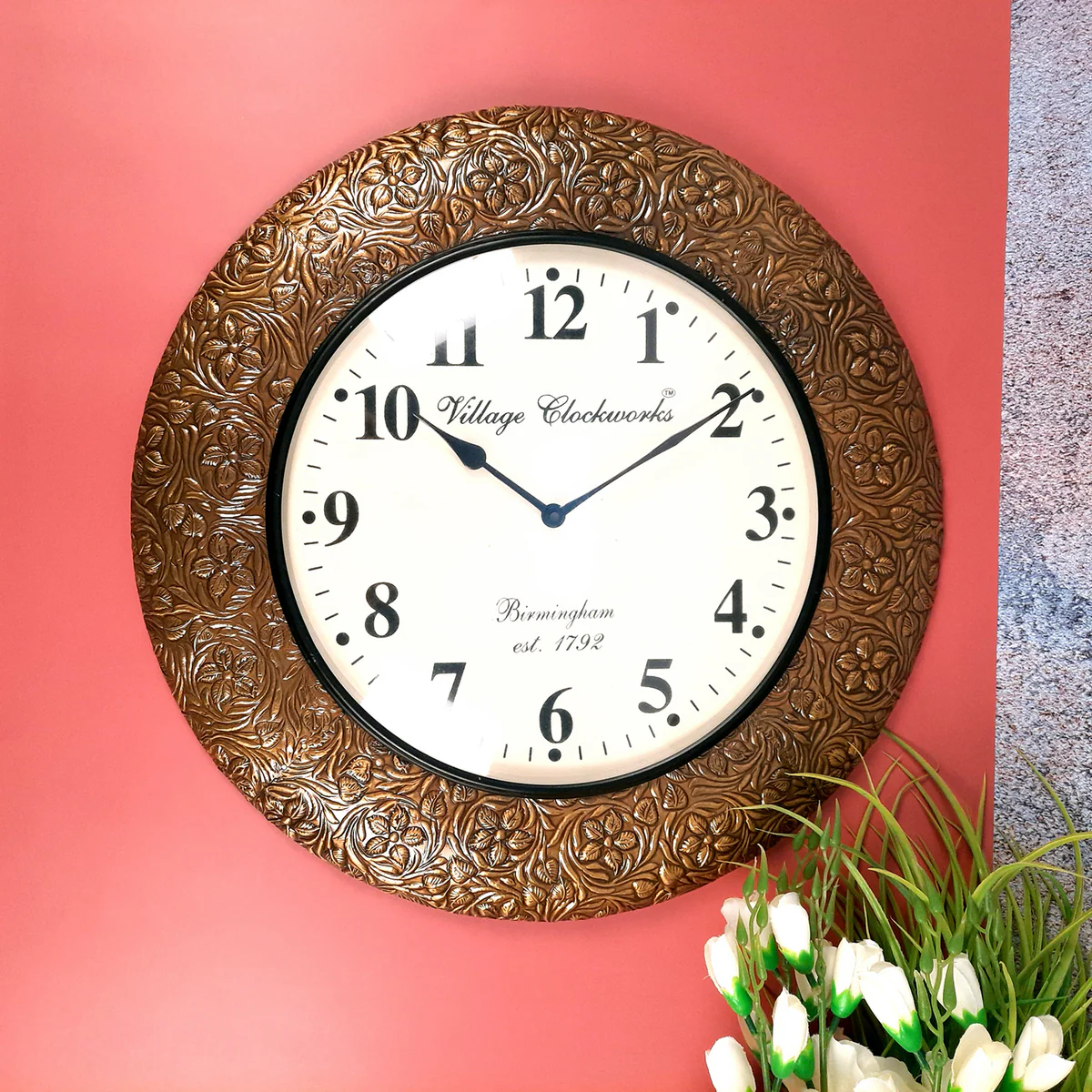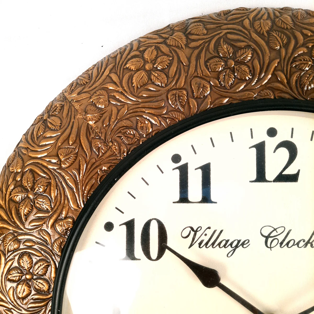 Enhance your home décor with this Antique Floral Designer Wall Clock, crafted to add elegance and timeless charm to any space. The beautifully embossed outer frame features intricate floral patterns with an antique bronze finish, giving the clock a luxurious vintage appearance. The clean cream dial with large Arabic numerals ensures easy readability while maintaining a classic decorative style.